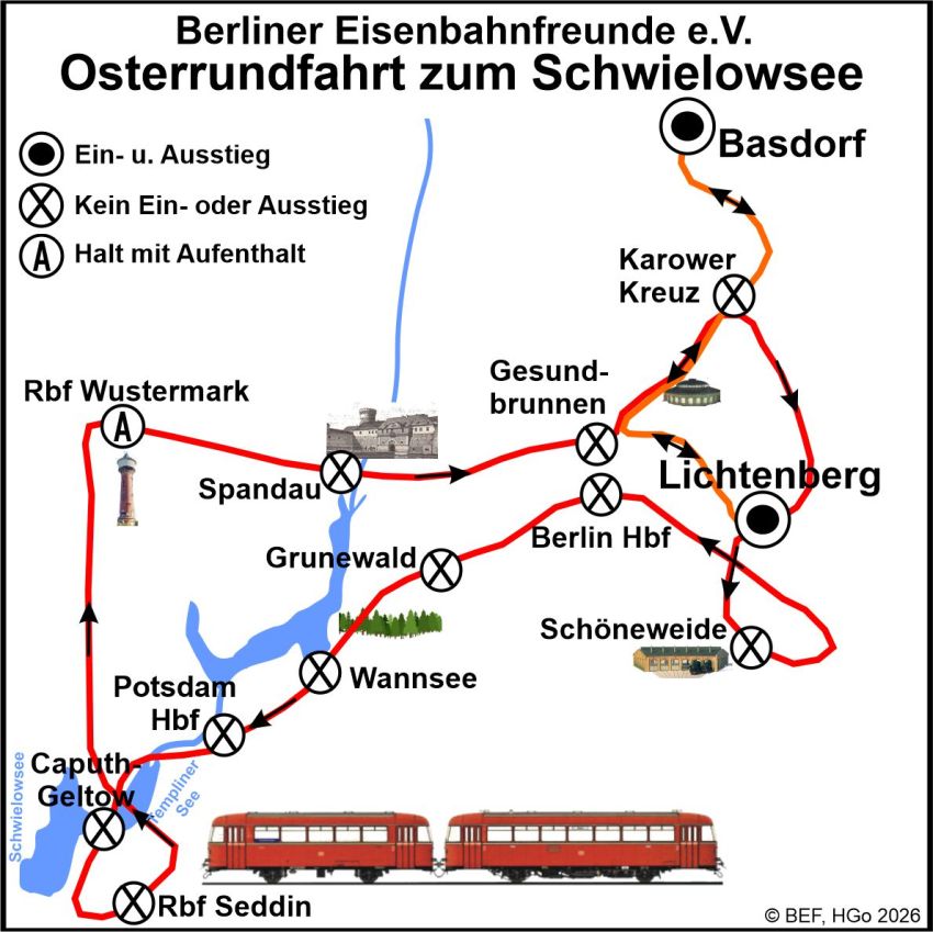 Am Bf Basdorf startet unsere historische Schienenbusgarnitur VT 95 / VB 142 und fährt über den östlichen Berliner Innenring nach Berlin-Lichtenberg. Dort setzen wir wir die Fahrzeuge um und nach dem Zustieg weiterer Fahrgäste fahren wir am Treptower Park vorbei auf die Görlitzer Bahn, passieren den ehem. Rangierbahnhof Schöneweide und biegen nach Osten ab. Nach einer langgezogenen Kurve geht es weiter vorbei am ICE-Instandhaltungswerk Rummelsburg auf die Berliner Stadtbahn, der wir bis Charlottenburg folgen. Wir durchfahren den Grunewald und biegen kurz hinter dem Potsdamer Hauptbahnhof nach Süden ab. Bald darauf zeigt sich der Templiner See, hinter Caputh-Geltow erreichen wir dann den Schwielowsee. Nachdem wir Ferch-Lienewitz durchfahren haben, biegen wir nach Nordosten ab und kommen am Rangierbahnhof Seddin auf die Wetzlarer Bahn, die wir bereits hinter Michendorf wieder verlassen, um zum westlichen Berliner Außenring zu fahren. Hinter Priort biegen wir dann in den an der Lehrter Bahn gelegenen Rangierbahnhof Wustermark ein.