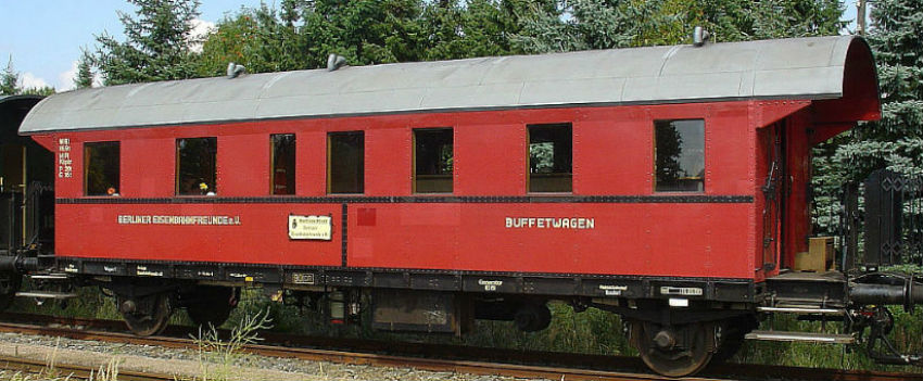 Ein Jahr nach der Gründung des Vereins im Juni 1979 konnte der erste Personenwagen von der Deutschen Bundesbahn erworben werden. Auf eigenen Achsen rollte er in Güterzügen vom Ausbesserungswerk Weiden zu seinem ersten Berliner Standort auf dem Werksgelände der Waggon-Union (WU) in Borsigwalde. Im Jahre 1980 begannen wir im Werksgelände der WU mit der Aufarbeitung des Wagens, der Wagenkasten wurde gesandstrahlt und teilweise mussten neue Bleche eingebaut werden. Der Wagenkasten erhielt seine rote Lackierung und im Innenraum fanden Wandpaneele Verwendung, die aus Abfallplatten der Berliner U-Bahn gewonnen werden konnten. Mit der Unterstützung einer großen Berliner Brauerei konnte im großen Abteil eine Schanktheke mit Kühlung eingebaut werden. Im kleineren Abteil konnten Sitzgarnituren aus Quick-Pick Speisewagen eingebaut werden, die 11 Personen einen Sitzplatz bieten. Am 18. August 1982 ergolgte die Abnahme durch die Berliner Eisenbahn Aufsichtsbehörde.